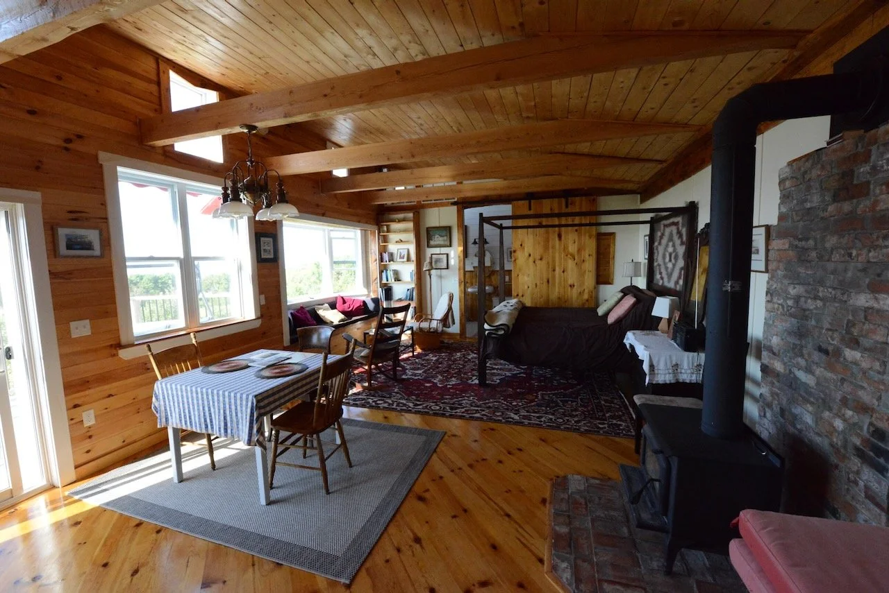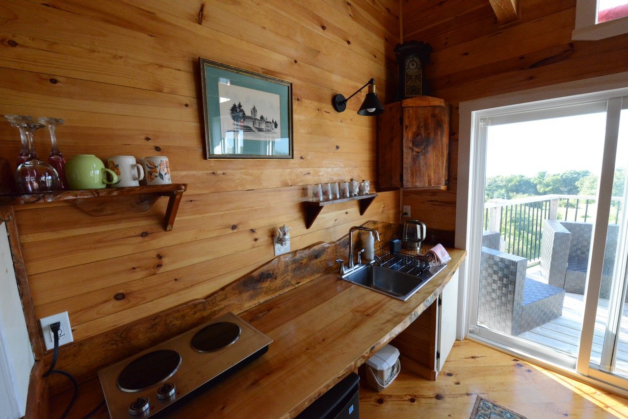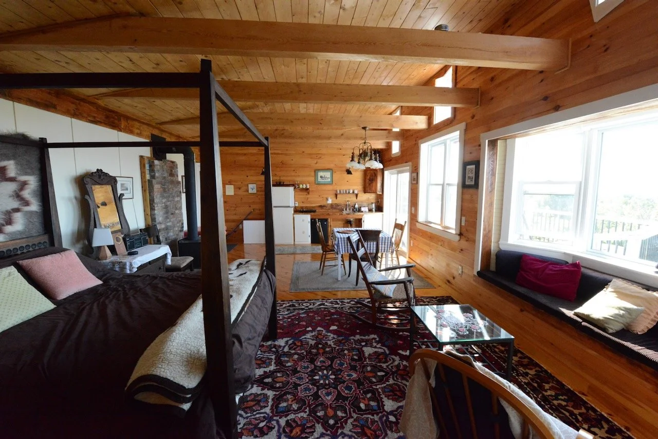 The Rose Cabin is our largest cabin with over 500 square feet of beautiful, barrier-free space. Built from local Hemlock beams with high ceilings and large windows, it has a wonderfully modern feel while remaining warm and inviting. A panoramic view of the MareGold fields, Point Prim lighthouse, and the Bay of Fundy stretches out before you — and a large private deck gives you the perfect spot to watch the best sunsets in Nova Scotia.